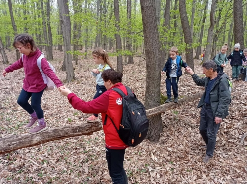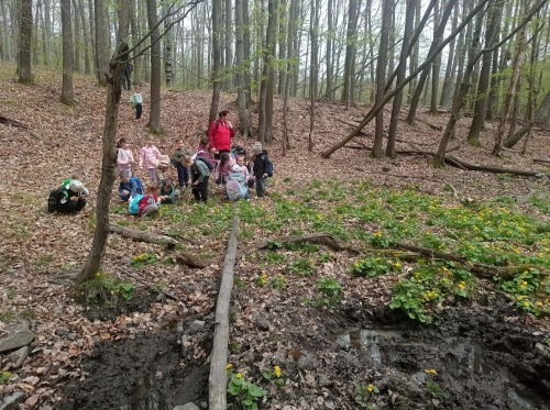 Minden csoportnak jutott ideje a megfigyelésekre, a természet felfedezésére, a szépségek észrevételére – így a Föld napjához közeledve különösen előtérbe került ez. A nagyok már olyan jó tempóban haladnak, hogy sok idejük jutott „bogarászásra”, minden élőlény felfedezésére, és mozgásos játékokra a Tetves-réten. „A jókedvű turistát szereti az Isten” – szoktuk mondani a Kékes TE-ben, s a természet adta is a csodáit: a gyönyörű időt, a madarak koncertjét, a gólyahír mezőt, erdei virágokat, kígyót-békát, (na jó, …az előbbi erdei sikló volt!) erdei pockot, s rengeteg rovart, bogarat. Már a gyerekek is észrevették maguktól az erdő nagyfokú szárazságát. A forrásokból is alig folydogált a víz. „Pedig amikor máskor itt jártunk…” - mondták.
